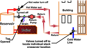 The evaluation team proceeded to turn off the cold water in each stack to see if the boiler return spigot drain would stop. If so, then that stack was identified as having a crossover. This would narrow down the results to only two or three units in a stack instead of a whole building. With three and half building involved, the team had to turn on and turn off a potential of 28 valves and check back with two boilers.