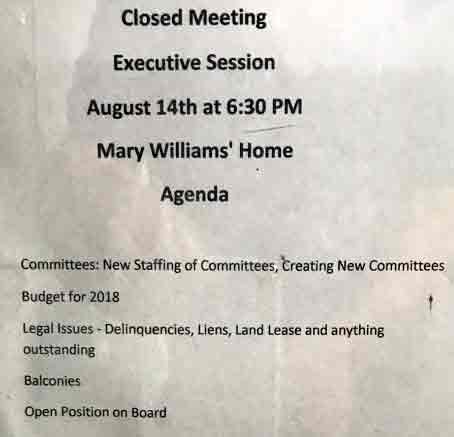 The HOA has a “Rules and Regulations Committee” which has one member which is the current Board President Mary Williams. This committee never holds public meetings or asks for others to participant.