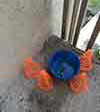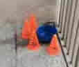 A Bee Hive in the wall of the stairwell in the 4861 Lago building was dripping honey from the roof down onto the landing of the stairwell. A bucket was placed to collect the dripping, sticky honey and red cones were placed around the bucket.