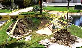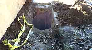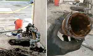 In response to backed up sewer lines in the 16542 Blackbeard building, a six foot deep by six wide hole was excavated in the sidewalk. Scott English Plumbing was able to get the sewer line open quickly. But the next day, it backed up again. Using a video camera they ran from the Blackbeard building, they located plant roots intruding into the pipes. Excavating for a couple of days down to more than six feet , they located the failing sewer pipes. Broken and shattered by roots, the pipes had not been properly glued when installed. They rebuilt the line and have added some cleanout traps to the lines to improve efficiency if this problem occurs again. Located buried at the same depth as the failing pipes was a crushed Core Beer can. Go figure.