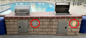 Two new barbecues replaced the old ones at the Cabana Pools. These new barbecues will automatically turned off it left on inadvertently using a timer switch (circled in red) which need to be activated to use them. This switch will allow gas to each BBQ so they can be lit. Or it is suppose too. As of this writing, only the left BBQ is working which has been reported to the HOA. As part of this installation, new cage was placed around the master valve and locks were installed to the cabinets below the barbecues to prevent anyone from inadvertently tuning off the main gas lines.■ |