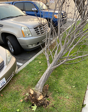 The grassy areas against these Lago parking spaces had several trees in the past. Only one full grown tree is now left standing. About a year and a half ago, a resident had tripped from an indent left by a fallen tree.