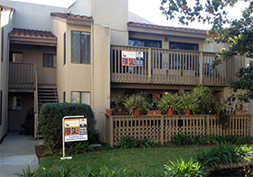 themselves in a dilemma as to where they can hang their signs. One “For Sale” sign is hanging from the patio roof for a Grunion property that is on the market (see picture) so it can be seen from Heil. This violates all sorts of Association rules. Another real estate sign has been placed in the Common Area grass by a unit on Lago