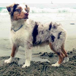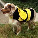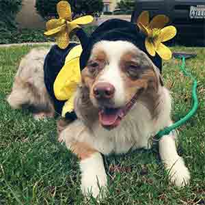 Elvis is a handsome 11 month old Australian Shepherd who lives with his owners on Cabana. He was adopted when he was 8 weeks old and has grown to 53 pounds. He's very friendly and energetic. He loves going to dog beach and has doggie play dates at the dog park in Newport Beach. His 2 best doggie friends in Harbour Vista are Bailey and Cooper, two small white dogs that live on Lago. They have great fun playing together. The Australian Shepherd dog is an intelligent, energetic breed with strong herding and guarding instincts. They thrive on lots of mental and physical exercise. They need a sense of purpose to be truly content. Elvis is still in his puppy stage and craves lots of attention and play from the humans in his life. He is very friendly and likes to meet new people. For halloween, Elvis was dressed in his Bumble Bee costume. If you see him out on a walk stop and say hello.■