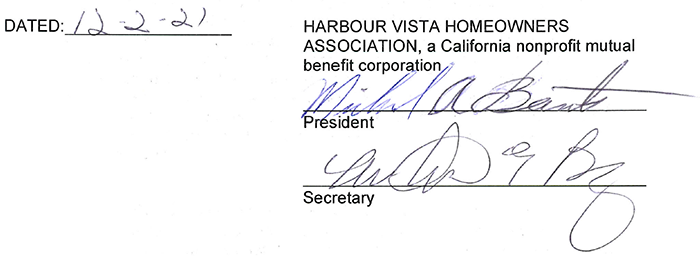 IN WITNESS WHEREOF, we, the Members of the Association, pursuant to the requisite approval, and by means of the signatures of the President and the Secretary, do hereby affirm, approve, and adopt this First Amendment in accordance with Article XIII, Section 13.02 (“Amendment”), of the Declaration, by means of the signatures of the President and the Secretary, and which First Amendment shall be recorded with the Recorder of the County of Orange, State of California.