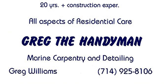 ![]() This page is devoted to Advistising Goods and Services from Residents of Harbour Vista. This is a free serivce. To place an an ad or announcement, contact Harbour Vista News (Tel: 714-883-1949) or by email mbarto@logiqwest.com