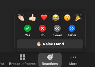 The Reactions icon is very useful for giving feedback on the meeting proceedings or for raising a hand to ask a question or be recognized. You may of course, also raise your hand when you are on camera.
