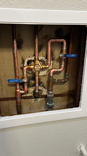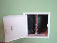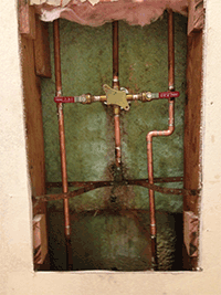 This is an example of a bottom unit, where shower/tub shutoff valves to the second bedroom have been installed accessed through the master bedrooms closet. Note: On this bottom unit, shutoff valves are place for the local lines to the shower/tub valve and do not affect the lines going to the units above. When complete, an access panel wbe installed behind a shelving project for this closet. Manhy new show/tub pressure balance vlves, have cartridges which need clean or replaced from time to time. Therefore this homeowner will not impose on his neighbors, the next time he needs some plumbing maintenance.